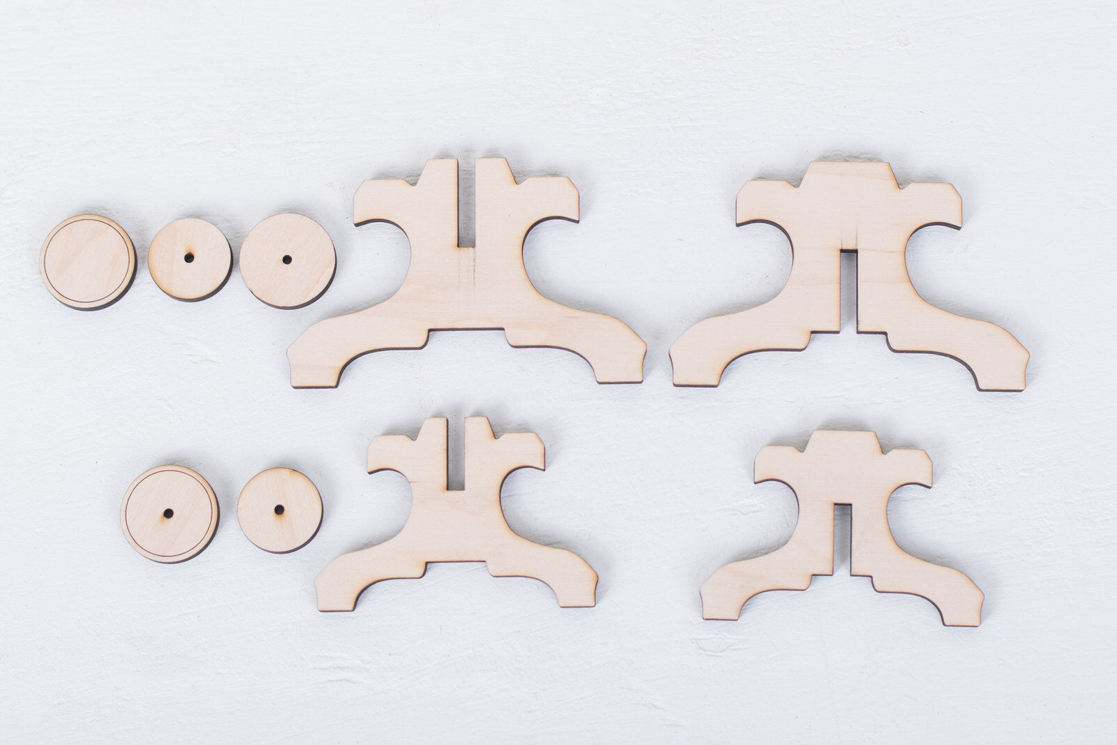 Everything is laser cut out of 1/4" Maple OR Baltic Birch and unfinished. Charring is normal around the edges and will wipe off or be covered in paint/stain.