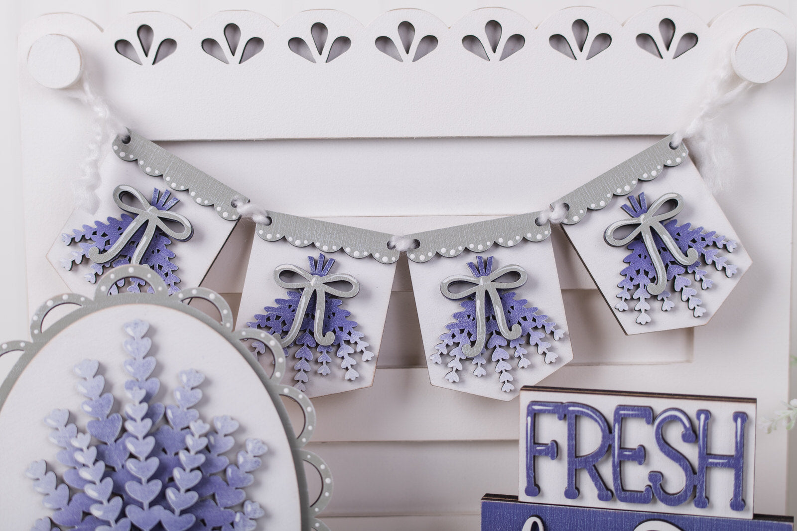 - Features a lavender banner, round insert, oval scalloped frame with easel, square insert , and layered “Fresh Lavender Market” shelf sitter