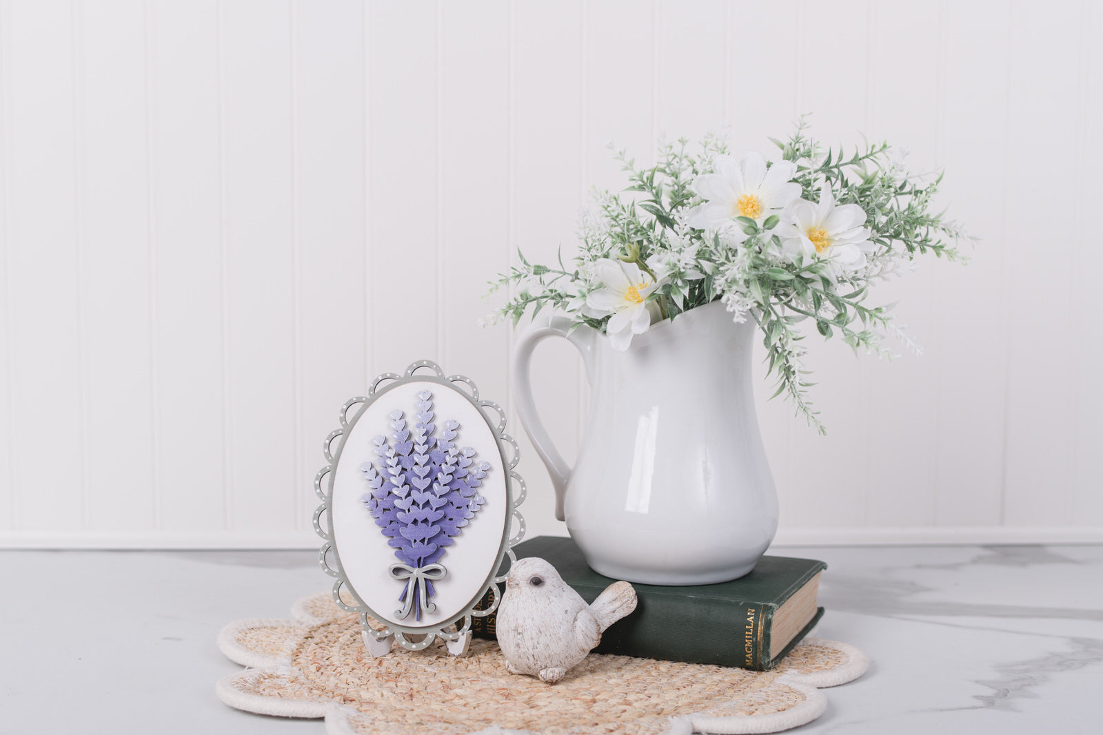 This lavender decor set or tiered tray set, includes a collection of coordinating pieces designed to work together for a full, styled look. Featuring layered lavender bundles, scalloped details, and farmhouse-style lettering, each piece adds charm and dimension to your summer decorating.